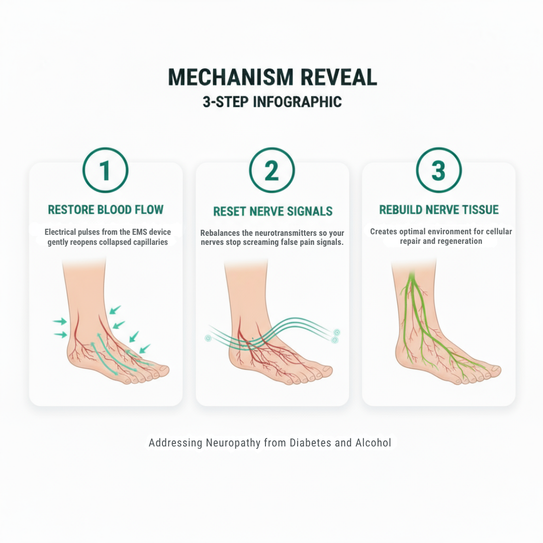 Most treatments only address one problem. Medications mask the signals. Vitamins try to feed nerves that can't receive them. Physical therapy helps mobility but doesn't rebuild damaged tissue. This device is different. The EMS component forces blood into those collapsed capillaries—actively opening dormant vessels and pushing oxygen to starving nerve tissue. The grounding technology resets the nerve chemistry that's causing false pain signals. It's gentle, targeted, and you control the intensity. My patients use it on the couch or at 2 AM when symptoms flare. Many describe their nights as more manageable once it becomes part of their routine. If you quit drinking but you're still numb—if the vitamins didn't work and "just wait" isn't working—this is worth trying. You did the hard part. You got sober. You deserve to feel like yourself again.